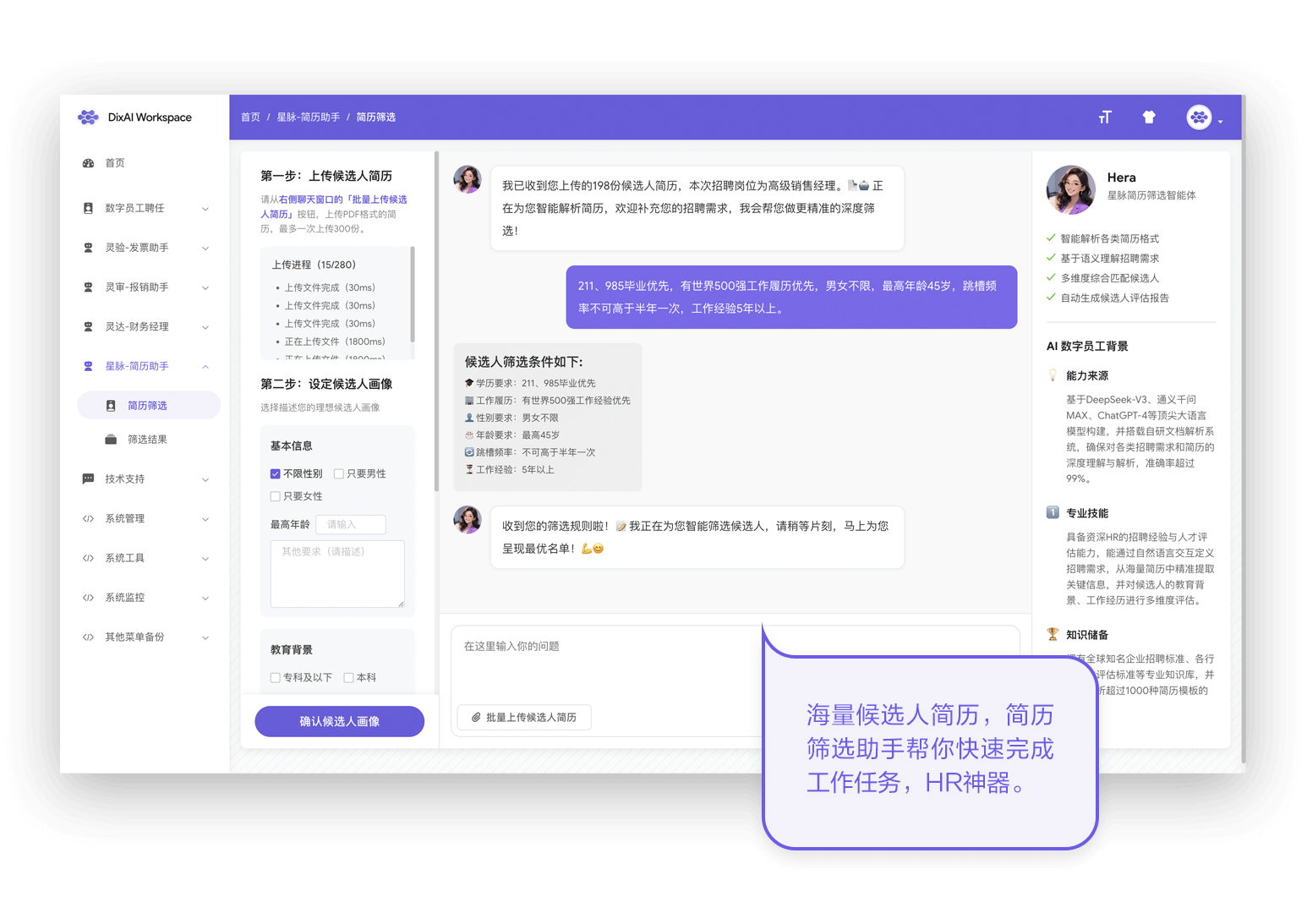 某知名互联网公司 人力资源总监作为一家快速发展的科技公司,我们每天都要处理大量的简历投递。自从使用了DIX AI的星脉简历筛选助手,我们的招聘效率提升了300%,HR团队可以专注于更有价值的面试环节,而不是在简历筛选上花费大量时间。Hera的智能匹配能力非常出色,能够准确理解我们的招聘需求,找到最合适的候选人。